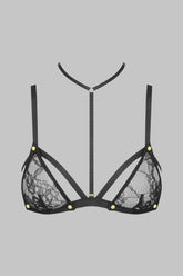 Der Triangle-BH mit Harness JEUX MAGNÉTIQUES umarmt eine kühne Offenheit. Bügellos, hüllt er die Brust in zarte florale Spitze und lässt sich dank einer Reihe goldener Magnetknöpfe vollständig öffnen. Eine Architektur, so fein wie subversiv. Unter der Brust sorgt ein mit Mikrofaser überzogenes Gummiband für Weichheit und Halt. Das abnehmbare Harness, das um den Hals gelegt wird, vollendet das Stück, indem es die Dekolletélinie betont. Ein vielseitiger BH, der sich nach Wunsch und Moment verwandeln lässt.