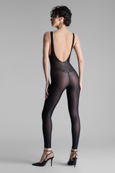 Catsuit mit breiten Trägern, gefertigt aus einem feinen Jersey mit glänzenden und dezent transparenten Reflexen. Enganliegender Schnitt, eingefasst mit einem ultraflachen und komfortablen Gummiband. Sein Dekolleté, die tief ausgeschnittenen Armausschnitte und der atemberaubende Rückenausschnitt erinnern an die 90er Jahre. Das goldene Maison Close Logo ist im unteren Rücken platziert.