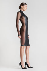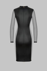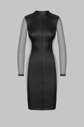 Langärmeliges zu öffnendes Kleid in doppelter Optik: mattes Leder und transparenter Tüll. Grafische Ausschnitte aus Tüll, die den Arm betonen und die Seiten der Silhouette freilegen. Vorne und hinten mit zwei Zweiwegereißverschlüssen mit vergoldeten Ringen zu öffnen. Als Kennzeichen der Kollektion ziert ein vergoldeter Ring im "Feti-Chic" den Kragen und regt zum Festbinden an.