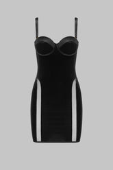 Das Samtkleid ROCOCO, inspiriert von der Korsetterie, modelliert die Silhouette mit sanfter Präzision. Flexible Stahlstäbchen strukturieren den Schnitt und betonen die Taille, während die Cups mit feinen Schalen und Bügeln sowie herausnehmbaren Polstern einen kontrollierten Push-up-Effekt erzeugen.