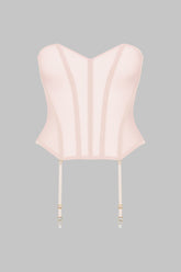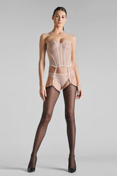Strumpfhalter-Korsett aus absolut transparentem Tüll. Vorne und im Rücken durch biegsame, vertikale Stäbchen strukturiertes Korsett. Quer verlaufende Nähte gehen in verstellbare, abnehmbare Strumpfhalter über. Nahtlose, gefütterte Seitenpartien für eine sublimierte Silhouette.