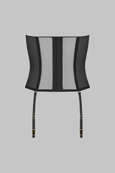 Das L’AMOUREUSE-Strapskorsett aus absolut transparentem Tüll zeigt sich in einer an klassische Anzüge angelehnten Silhouette mit geradem Ausschnitt und quer verlaufenden Nähten, die durch weiche vertikale Stäbchen strukturiert sind. Doppellagiger Tüll an den Seiten betont die Hüften und verlängert sich in verstellbare, abnehmbare Strapse. Sanfter, zarter Hakenverschluss hinten.