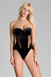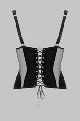 Gesteppter Samt kleidet Brust und Hüften, im Kontrast zu ultratransparentem Tüll an den Seiten, der klare Linien entlang des Oberkörpers zeichnet. Die breiten Träger, vorne mit Samt überzogen, sind verstellbar und abnehmbar, um den Look nach Wunsch zu variieren. Am Rücken ermöglicht eine verstellbare Schnürung mit goldfarbenen Ösen und Schmuckenden eine präzise Anpassung der Taillierung.