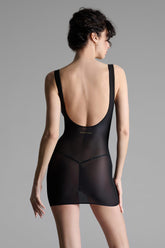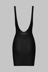 Kurzes Kleid mit breiten Trägern, gefertigt aus einem feinen Jersey mit glänzenden und dezent transparenten Reflexen. Enganliegender Schnitt, eingefasst mit einem ultraflachen und komfortablen Gummiband. Sein Dekolleté, die tief ausgeschnittenen Armausschnitte und der atemberaubende Rückenausschnitt erinnern an die 90er Jahre. Das goldene Maison Close Logo ist im unteren Rücken platziert.
