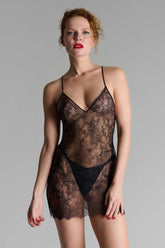 Kurzes Kleid aus transparenter Wimpernspitze. Der V-Ausschnitt und der Neckholder umspielen sanft die Silhouette. Zarte, im Rücken gekreuzte Träger aus Seide zum Verstellen mit goldenen Details.
