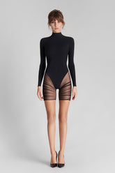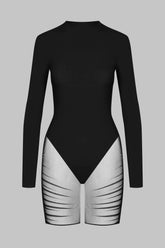 Langärmeliger Playsuit aus zwei Materialien. Das Oberteil in tief ausgeschnittenem String-Body-Stil ist aus blickdichtem Stoff gefertigt und wird durch einen eleganten Stehkragen ergänzt. Der rückseitige Reißverschluss ist mit goldfarbenem Zierschmuck besetzt.