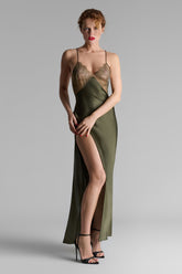 Langes Kleid aus Seide und Wimpernspitze. Sehr feminine Form mit langem Schnitt aus fließender Seide und Schlitz. Der V-Ausschnitt vorne und der mit fester Spitze verzierte Neckholder umspielen sanft die Figur. Zarte, im Rücken gekreuzte Träger aus Seide zum Verstellen mit goldenen Details.