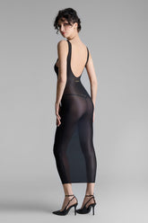 Langes Kleid mit breiten Trägern, gefertigt aus einem feinen Jersey mit glänzenden und dezent transparenten Reflexen. Enganliegender Schnitt, eingefasst mit einem ultraflachen und komfortablen Gummiband. Sein Dekolleté, die tief ausgeschnittenen Armausschnitte und der atemberaubende Rückenausschnitt erinnern an die 90er Jahre. Das goldene Maison Close Logo ist im unteren Rücken platziert.