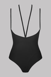 String-Body mit offenem Brustteil aus blickdichter Mikrofaser mit elastischen Zackenkanten. Der anliegende Schnitt wird durch zwei vorn gekreuzte und im Schritt zu öffnende Stoffleisten strukturiert. Das grafische Dekolleté unter der Brust wird durch den elastischen Harness mit Zackenkante verlängert. Durch tonige Accessoires gehaltene Träger.