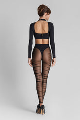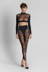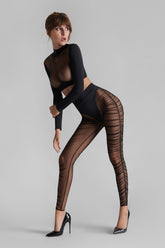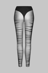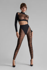 High-Waist-Leggings aus zwei Materialien. Der tief ausgeschnittene String-Einsatz, der vorder- und rückseitig aus blickdichtem Material gefertigt ist, wird durch einen breiten, verdeckten Gummibund akzentuiert und sorgt für eine langgestreckte, feminine Silhouette. Transparenter Tüll, dem seitliche Faltennähte eine aparte Strukturierung verleihen, formt katzenhaft sinnliche Beine.