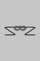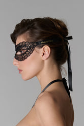 Maske aus feiner Guipure-Spitze, die sich wie ein Schmuckstück an das Gesicht schmiegt und für einen mysteriösen Look sorgt. Zartes Satinband mit einem goldenen Maison Close-Logo, das Sie nach Belieben binden oder lösen können.