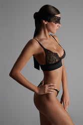 Spitzenmaske, die sich wie ein Hautschmuck an das Gesicht schmiegt. Ein zartes Band aus Naturseide, das Sie nach Belieben um Ihre Augen, Handgelenke oder Knöchel binden und wieder lösen können. Personalisiert durch eine goldene Maison-Close-Signatur auf der Seite.
