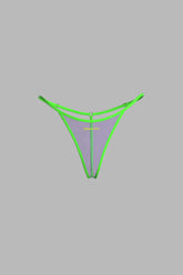 Micro-String aus transparentem Pastelltüll, strukturiert durch ein ultraflaches Neon-Gummiband. Die Seiten sind dank goldfarbener Versteller individuell regulierbar und ermöglichen eine präzise Passform. Ein zentraler Ring auf der Rückseite betont elegant die Linie des unteren Rückens. Maison Close Logo als Relief auf der Vorderseite. Ohne Baumwollfutter für ein vollständig transparentes Finish.