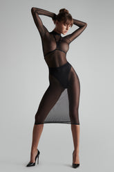 Das Midi-Kleid in Schwarz mit langen Ärmeln besteht aus weichem Tüll mit schillernd transparenter Optik.
