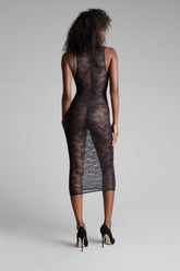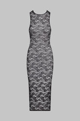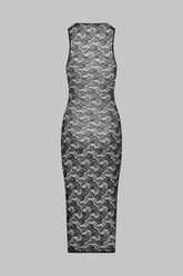 Das lange Kleid ohne Ärmeln ist mit Lochspitze verziert, die größtenteils aus recyceltem Material gefertigt wird. Eng anliegender Schnitt und flaches Gummiband. Midi-Länge, die die Kurven betont, für einen selbstbewussten 80er-Jahre-Stil.