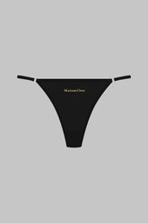 Mini-String gefertigt aus einem feinen Jersey mit glänzenden und dezent transparenten Reflexen. Eingefasst mit einem ultraflachen Gummiband, das unter der Kleidung unsichtbar ist. Sehr feine elastische Bänder sind durch einen goldenen Ring am unteren Rücken verbunden. Das goldene Maison Close Logo ist vorne angebracht.