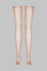 Die kultigen Strümpfen mit gerolltem Schnitt von Maison Close. Nudefarben mit weiss Naht, passend zur Kollektion ACCROCHE COEUR.