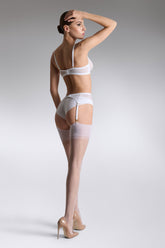 Nylonstrümpfe sind wahre Symbole der Weiblichkeit und Eleganz. Der zarte Glanz der mit nur 15 Denier unglaublich feinen und transparenten Strümpfe formt und verschönert das Bein. Die Nylonstrümpfe werden in Frankreich in einer der letzten Werkstätten weltweit hergestellt. Ihr Entwurf und ihre Seltenheit machen sie zu einem ultimativen Luxusaccessoire. In Verbindung mit einem Strapsgürtel von Maison Close verlängern sie die Silhouette ohne störende Linien. Für einen perfekten Herz-Effekt bis unter den Po hochziehen.