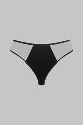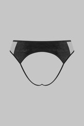 Der offene ROCOCO-Slip spielt mit Transparenz und grafischen Linien. Zwei Einsätze strukturieren die Vorderseite, während ultratransparenter Tüll die Hüften subtil enthüllt. Am Rücken setzt die Öffnung die Kurven in Szene, betont durch ein Samt-Elastikband, das das Gesäß formt. Dieses Stück wird als selbstbewusstes Verführungsaccessoire getragen und lässt sich ideal mit den Korsetts und Bustiers der ROCOCO-Linie kombinieren.