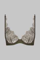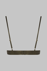 Triangel-BH aus Seide und Wimpernspitze. Gepolsterte Cups, Triangel-Form aus fester, transparenter Spitze, die sich an das Dekolleté anschmiegt und es ziert. Cups mit Seide bezogen. Verstellbarer Hakenverschluss am Rücken. Zarte verstellbare Träger mit goldenen Details.