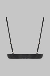 Triangel-BH aus Seide und Wimpernspitze. Gepolsterte Cups, Triangel-Form aus fester, transparenter Spitze, die sich an das Dekolleté anschmiegt und es ziert. Cups mit Seide bezogen. Verstellbarer Hakenverschluss am Rücken. Zarte verstellbare Träger mit goldenen Details.
