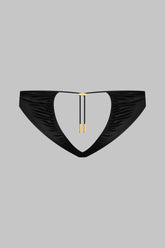 Offener Slip, der satinierten Komfort mit stilvoller Raffinesse vereint. Entworfen, um die hübsch geformten Herz-Po-Kurven elegant zu enthüllen. Die Öffnung ist mit einer plissierten Schnürung verziert, die die Silhouette perfekt betont und dank eines einzigartigen Schiebers sowie goldfarbener Lipstick-Accessoires mit Maison Close Signatur individuell angepasst werden kann.