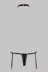 Body-String aus elastischer Spitze mit Blumenmuster. Verstellbare Schalform, die im Nacken geöffnet werden kann. String, der von vorne nach hinten geöffnet werden kann. Verstellbarer Gummibund. Vier abnehmbare und verstellbare Strapsgürtel mit goldenen Verzierungen.