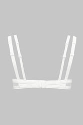 Seine zweifache Materialkonstruktion verbindet transparenten Tüll und undurchsichtige Mikrofaser in einem subtilen Dialog zwischen Opazität und Leichtigkeit. Die Bügel bieten präzisen Halt, während der verstellbare, integrierte Harness die Dekolleté-Linie mit bewusster Absicht betont. Verstellbarer Verschluss mit Haken auf der Rückseite.