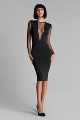 Der tiefe V-Ausschnitt verlängert den Oberkörper subtil, während der ultra-transparente Rücken einen Second-Skin-Effekt schafft, der im Kontrast zum undurchsichtigen Vorderteil steht. Die Midi-Länge berührt das Bein leicht für einen raffinierten, zugleich eleganten und intensiv sinnlichen Look.