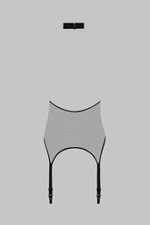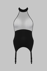 Auf der Rückseite zeigt sich der ultra-transparente Rücken in seiner ganzen Leichtigkeit, im Kontrast zu den strukturierenden Linien der Mikrofaser. Verstellbare und nicht abnehmbare Strumpfhalter verlängern elegant die Körperlinie, zu tragen mit oder ohne Höschen.