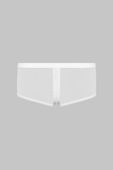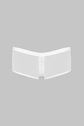 Der öffnungsfähige Shorty Pure Tentation ist eine direkte, aber stets kontrollierte Aussage. Der Low-Rise-Schnitt betont die Hüften mit Leichtigkeit, während der ultra-transparente Tüll die Grenze zwischen Kleidung und Haut verwischt. Am Schritt fügt eine Reißverschlussöffnung eine unerwartete Dimension hinzu, funktional und höchst suggestiv. Ohne Baumwollfutter bewahrt das Stück seine Fließfähigkeit und seinen Second-Skin-Effekt.