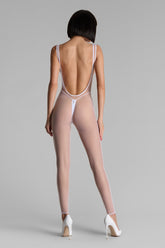 Ohne Baumwollfutter bleibt der öffnungsfähige Catsuit mit Trägern dem Geist der Linie treu: radikal, suggestiv und unendlich wandelbar.