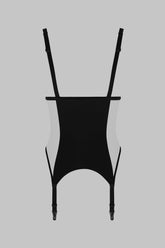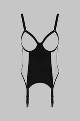 Die offene Form mit Bügeln strukturiert den Busen, lässt die Vorderseite weitgehend frei in einer bewussten Suggestion. Verstellbare Träger passen sich perfekt der Körperlinie an, während die nicht abnehmbaren, aber verstellbaren Strumpfhalter den Look nach unten verlängern, mit oder ohne Strümpfe kombinierbar.