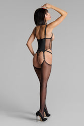 Der offene Catsuit mit Strumpfhaltern Pure Tentation verwischt die Grenzen zwischen Unterwäsche und Inszenierung. Seine zweifache Materialkonstruktion aus transparentem Tüll und undurchsichtiger Mikrofaser spielt mit Materialkontrasten, um die Silhouette durchsichtig zu zeichnen.