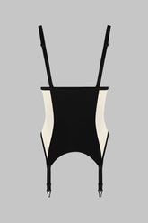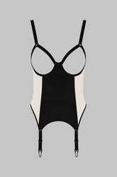 Die offene Form mit Bügeln strukturiert den Busen, lässt die Vorderseite weitgehend frei in einer bewussten Suggestion. Verstellbare Träger passen sich perfekt der Körperlinie an, während die nicht abnehmbaren, aber verstellbaren Strumpfhalter den Look nach unten verlängern, mit oder ohne Strümpfe kombinierbar.