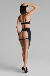 Der Pure Tentation Rock verwischt die Grenzen zwischen Unter- und Oberbekleidung. Aus transparentem Tüll und undurchsichtiger Mikrofaser liegt er wie ein grafischer Schleier auf der Haut und zeichnet die Kurven subtil nach. Zwischen Kleidungsstück und Inszenierung verwirrt dieser Rock die Codes. Transparent am Gesäß, spielt er mit dem, was er zeigt und andeutet. Der elastische Bund an der Taille sorgt für einen perfekten Sitz, während ein verstellbares und abnehmbares Gummiband am Rücken eine unerwartete Note verleiht, je nach Moment oder Absicht interpretierbar.