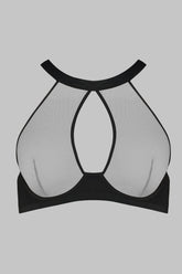 Das tropfenförmige, tiefe Dekolleté lässt die Haut durchscheinen, umrahmt von Tüll, der die Linie präzise zeichnet. Mit Bügeln, ohne Schaum oder Futter, bietet er natürlichen Halt und eine freie, ungekünstelte Ausstrahlung. Der Verschluss hinten erfolgt diskret mit Haken, verstellbare Träger sorgen für Anpassung.