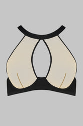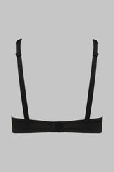 Das tropfenförmige, tiefe Dekolleté lässt die Haut durchscheinen, umrahmt von Tüll, der die Linie präzise zeichnet. Mit Bügeln, ohne Schaum oder Futter, bietet er natürlichen Halt und eine freie, ungekünstelte Ausstrahlung. Der Verschluss hinten erfolgt diskret mit Haken, verstellbare Träger sorgen für Anpassung.