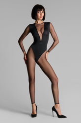 Der V-Ausschnitt-Langarm-Catsuit Pure Tentation umhüllt den Körper mit diffusem Licht. Bestehend aus transparentem Tüll und undurchsichtiger Mikrofaser schafft er einen Body-String-Illusionseffekt, der zugleich grafisch und sinnlich ist.