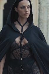 Wunderschöne barocke Spitze und feiner Plumetis-Tüll sind Mittel der Verführung. Ein Goldkreuz als Brosche sind Zeichen von Sinnlichkeit und Spiritualität.
