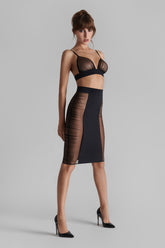 Bleistiftrock aus zwei Materialien. Transparenter, durch Falten und Nähte strukturierter Tüll akzentuiert die Silhouette und setzt sie feminin in Szene. Ein breiter, mit Stoff bezogener elastischer Taillenbund ergänzt den körperbetonten Look. Auf der Vorder- und Rückseite setzen blickdichte Stoffbahnen einen verspielt-diskreten Akzent. Ein einzigartiger Stil mit einem raffinierten Zusammenspiel von Hell-Dunkel-Kontrasten und eleganter Symmetrie.