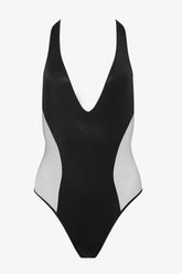 Der Rückenausschnitt-Einteiler Minuit kombiniert blickdichte Mikrofaser und transparenten Tüll zu einem subtil grafischen Effekt, veredelt durch einen schwarz-silbernen Metallic-Film, der für einen dezenten Glanz sorgt. Der tief ausgeschnittene Dekolleté und der freie Rücken offenbaren genau das Richtige, während der String-Schnitt die Silhouette optisch streckt. Dieses Modell zum Hineinschlüpfen ohne Öffnung im Schritt sorgt für eine elegante, fließende Linie. Der seitlich bis in den Rücken verlaufende Tüll, eingefasst mit glänzender Mikrofaser, verleiht dem Design eine sorgfältige Verarbeitung. Im Schritt gefüttert, bietet dieser Badeanzug dank feiner, weicher Elastikbänder und einem silberfarbenen Hakenverschluss im Nacken angenehmen Tragekomfort.