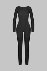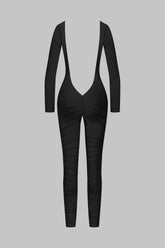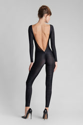 Jumpsuit mit langen Ärmeln und Rückenausschnitt aus Jersey mit schimmernden und subtil transparenten Akzenten. Der Hauptteil ist zur Gänze durch Faltennähte strukturiert und wird durch einen tiefen Rückenausschnitt ergänzt, der enthüllt, was entdeckt werden will.