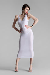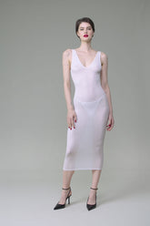 Langes, rückenfreies Midi-Kleid mit einzigartigem Tragegefühl. Dehnbares, ultraweiches und leichtes Ripp-Modal, das sich sowohl in der Version Glanz als auch in der Version Transparenz dehnt. Eng anliegender, schlichter Schnitt mit tiefen V-Ausschnitten vorne und am Rücken und breiten Trägern.
