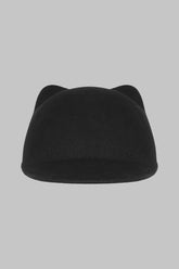 Die Katzenhut ist ein ebenso verspieltes wie raffiniertes Stück. Mit ihrem kurzen Schirm und den zwei katzenhaften Ohren erinnert sie an ein kaum geflüstertes Geheimnis, eine Dualität zwischen Unschuld und Wagemut. Vollständig aus schwarzer Wolle gefertigt, verbirgt sie im Inneren ein violettes Ripsband – die Signaturfarbe von Maison Close – für einen diskreten und zugleich markanten Akzent.