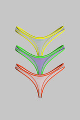 Set aus 3 Strings aus transparentem Pastelltüll, akzentuiert durch ein ultraflaches Neonelastik. Ein hoch ausgeschnittener Schnitt im 80er-Jahre-Stil an den Seiten, der die Beine optisch verlängert. Maison Close Logo in Relief auf der Rückseite. Ohne Baumwollfutter für vollständige Transparenz.
