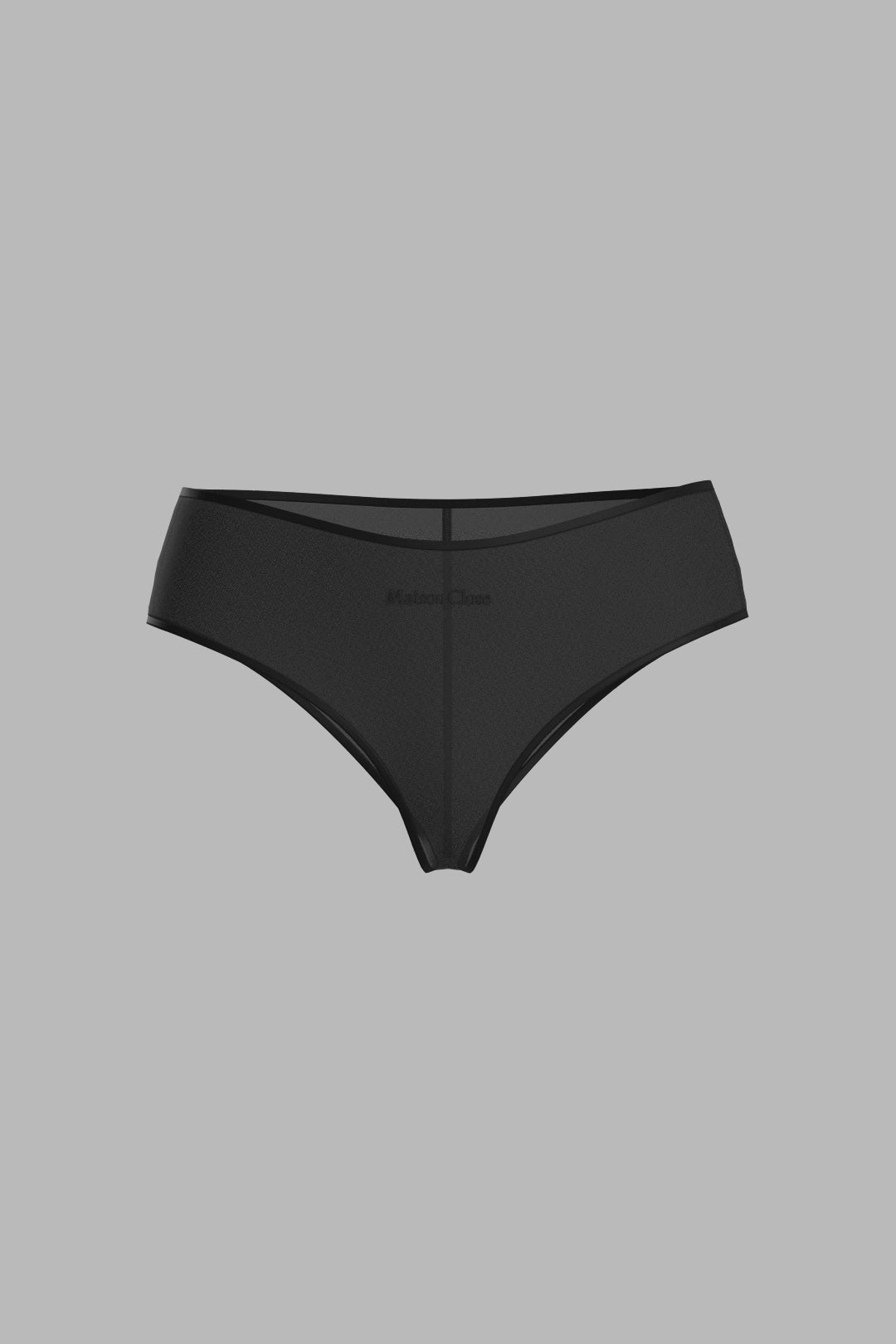 Hipster aus Mikrofaser mit Second‑Skin‑Effekt und etwas weiterem Schnitt über den Hüften. Das Material folgt dem Körper, ohne Abdrücke zu hinterlassen. Die Kanten sind mit einem ultraflachen, kontrastierenden Gummiband betont, das eine klare, feine Linienführung schafft. Das reliefierte Maison Close‑Logo am Rücken verleiht dem Stück eine stilvolle Note. Absoluter Komfort, chices Auftreten.