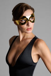 Die L’ANONYME Gold-Spiegelmaske wird wie ein Rätsel getragen. Diese einzigartige Kreation ist das unverzichtbare Accessoire für Rollenspiele, in denen Geheimnis und Eleganz regieren.