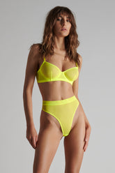 Der High Waist-String in Neonfarbe besteht aus einem weichen Tüll mit schillernder Transparenz.
