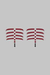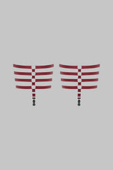 Strumpfbänder von Maison Close. Ein schickes Accessoire, das mit feinen silbernen Ringen und elastischen Strapsbändern in Bordeauxrot die Nacktheit kleidet. Verstellbar und komplett anpassbar. Dank der Ringe auf dem oberen Teil der Strumpfhalter passt dieses Modell zu all unseren Strapsgürteln. Vier verstellbare und abnehmbare Strumpfhaltern mit Silber Details greifen nach Strümpfen und verleihen dem Ensemble dem letzten Schliff.